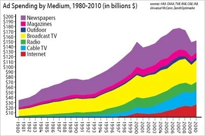 [8] Croteau and Hoynes (2003:49); New York Times Alamanac 2011 (2010) Penguin Books, New York.. New Half of this went into newspapers, magazines, television and radio.